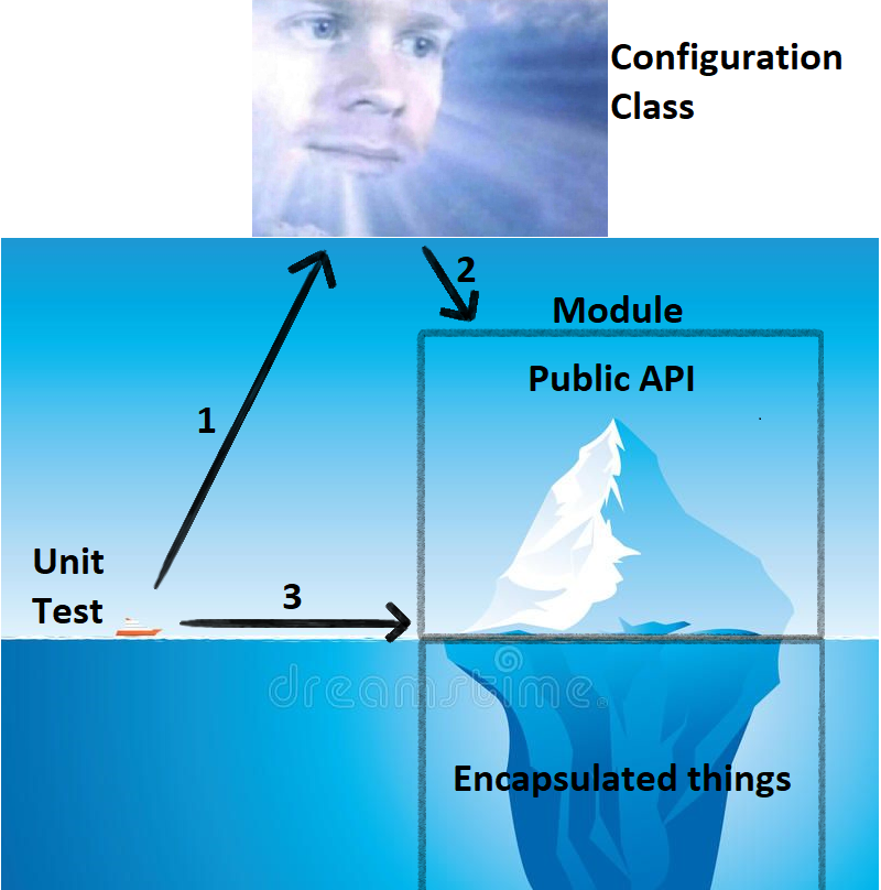- The unit test prays to the configuration class, requesting the materialization of the Ice Mountain module, and offering mocks of the modules used by it as sacrifice.